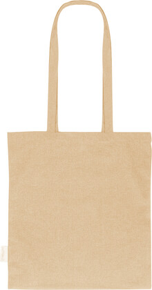 Nákupní taška s dlouhými uchy ze 70 % recyklované bavlny a 30 % RPET polyesteru, 140 g/m2. S výraznou etiketou o recyklované bavlně.