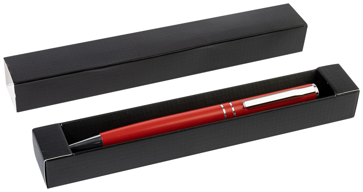 Kuličkové pero z recyklovaného hliníku s chromovanými částmi a kroužky. V černé dárkové krabičce. S modrou náplní.