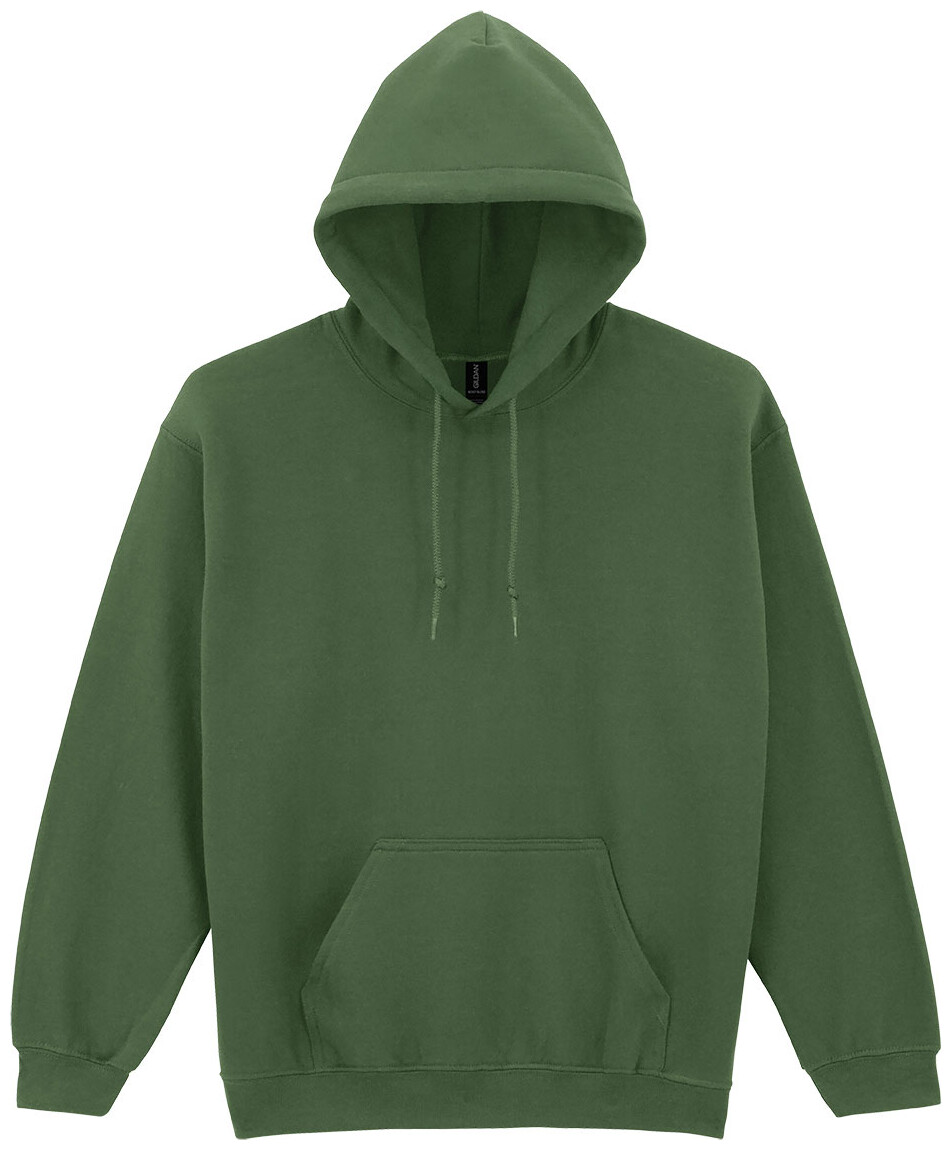 Mikina s kapucí z 50 % bavlny a 50 % polyesteru s přední kapsou. 271 g/m2 (bílá 257 g/m2). Výrobek značky Gildan.