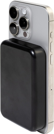 Power banka z recyklovaného ABS s baterií 5000 mAh a vestavěnou magnetickou bezdrátovou rychlonabíječkou (15 W). S USB-C vstupem a nabíjecím portem. Včetně samolepicího kovového kroužku pro použití magnetické funkce na jakémkoli bezdrátově nabíjecím zařízení. Kompatibilní s iPhone® 12 nebo novějším. Včetně nabíjecího kabelu USB.