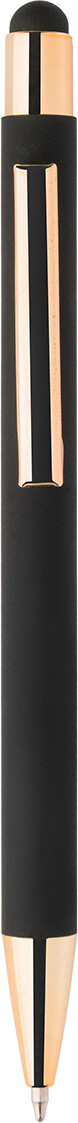 Kuličkové pero z recyklovaného hliníku na dotykovou obrazovku, s černým pogumovaným tělem a barevnými lesklými kovovými částmi. Se speciálním povrchem pro zrcadlové gravírování, které ladí s kovovými částmi. S modrou náplní.