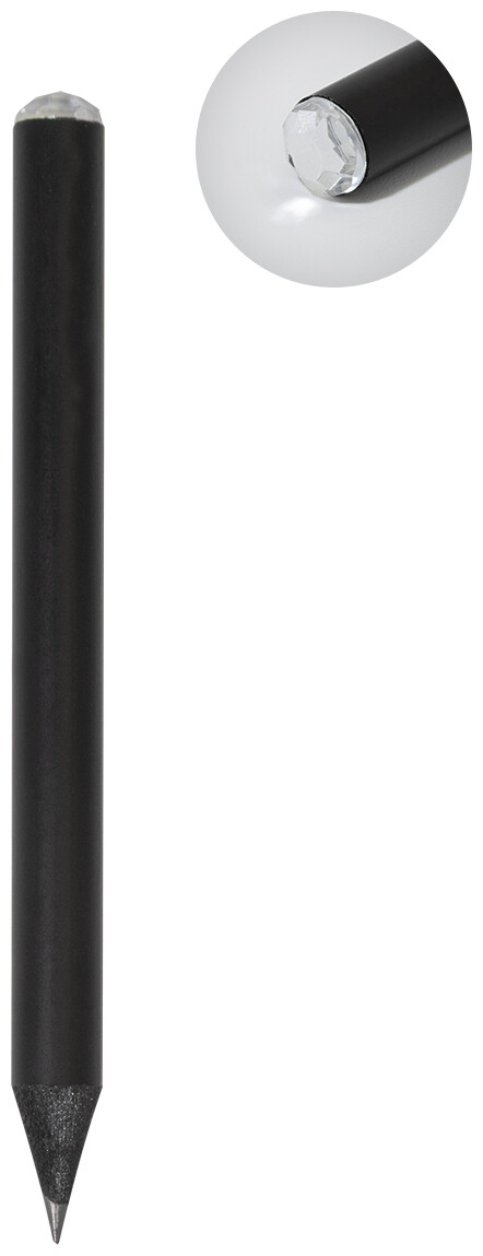 Černá mini dřevěná tužka s akrylovým ozdobnými kamínky. Ořezaná, třída HB.