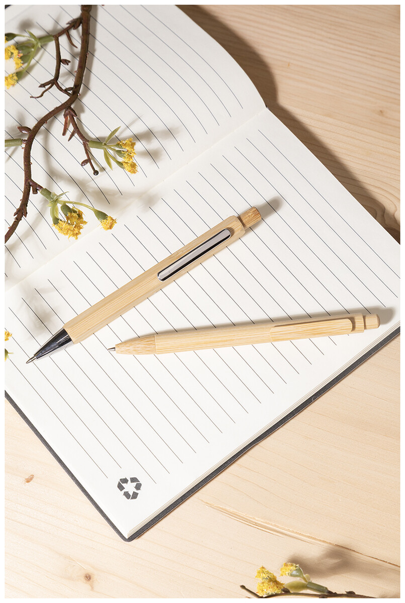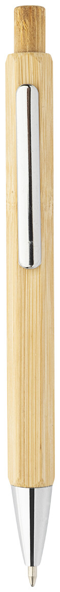 Šestihranné bambusové kuličkové pero s chromovanými částmi. S modrou náplní.
