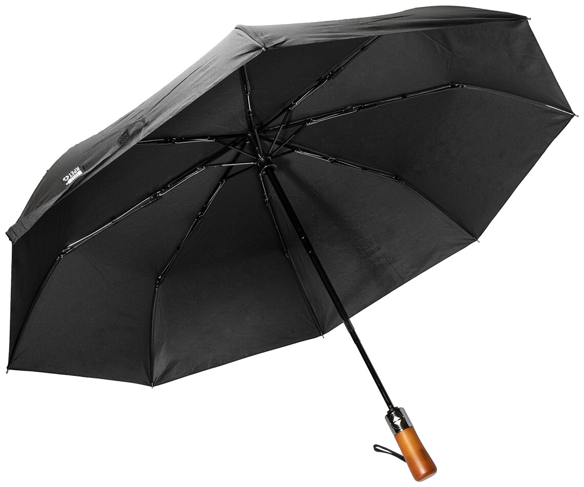 Velký, plně automatický (otevřít/zavřít) větruodolný skládací deštník s 8 panely a elegantní dřevěnou rukojetí s poutkem na ruku. S kovovým rámem a žebry ze skelných vláken. 190T RPET pongee. S charakteristickým RPET štítkem.