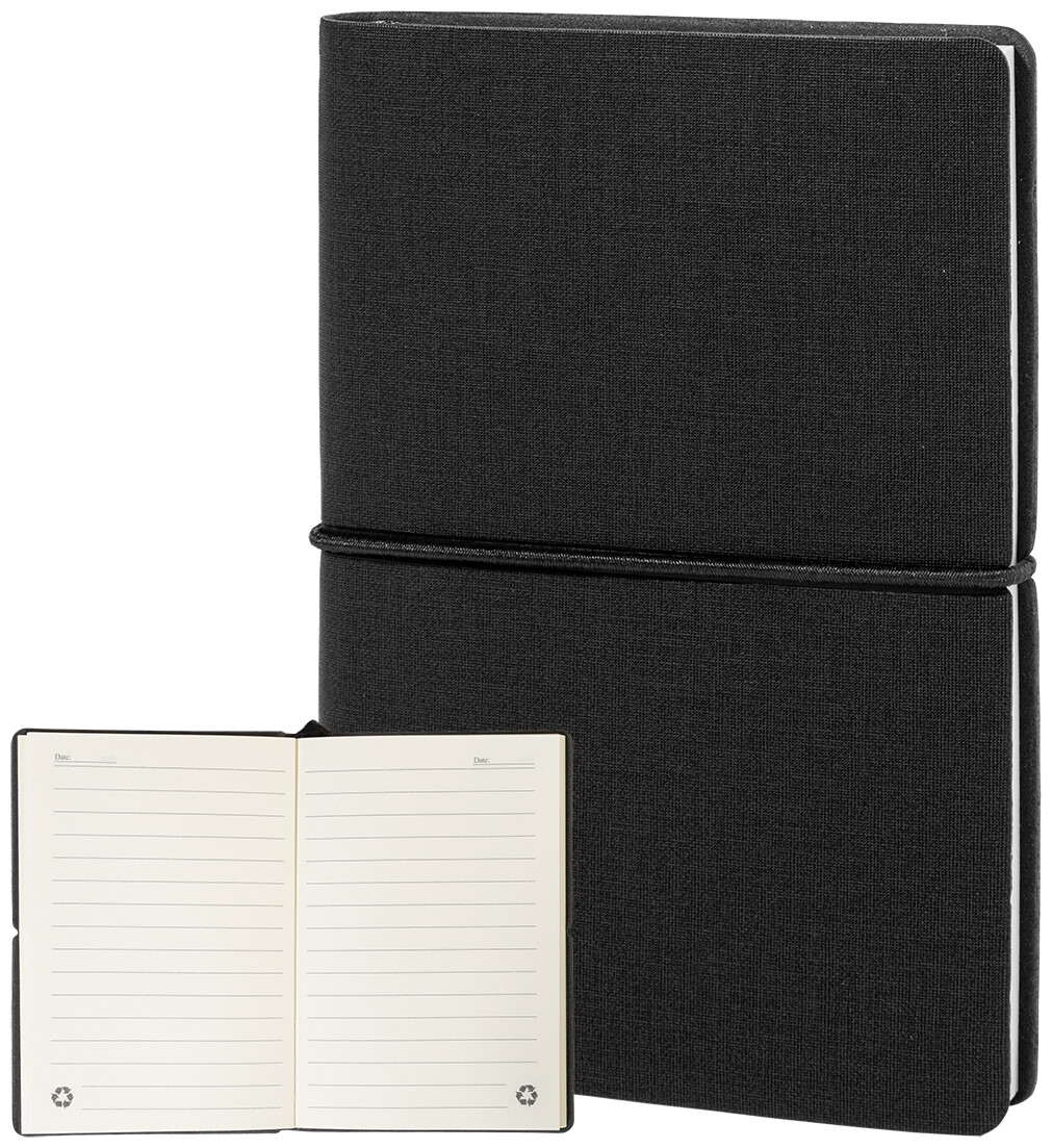 Blok A6 s recyklovanou PU kůží, 70 linkovanými listy z recyklovaného papíru, 25 samolepicími papírky a 125 značkovači stránek (v 5 různých barvách). Se záložkou a horizontálním gumovým páskem.