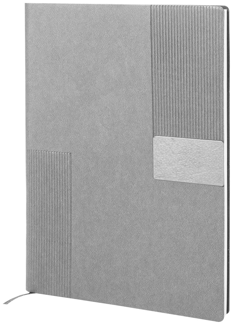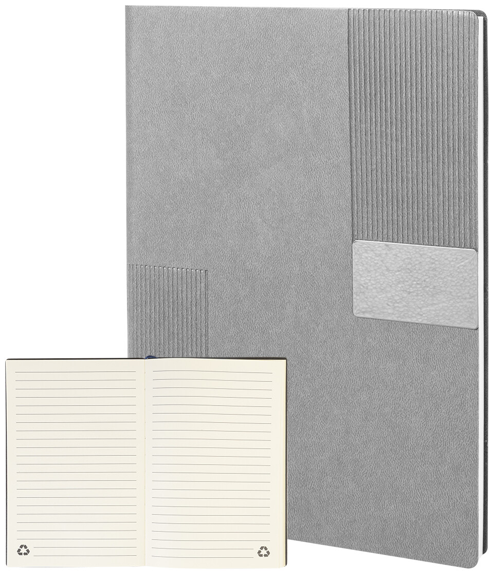 Blok A5 s recyklovanou PU kůží s pruhovanou dekorací a kovovou destičkou pro logo. Se záložkou a 80 linkovanými listy z recyklovaného papíru.