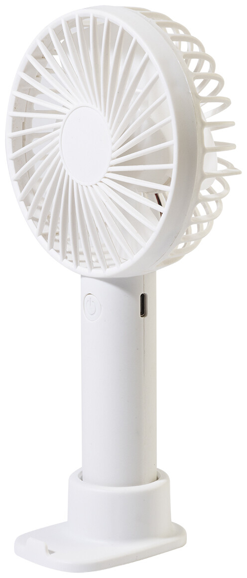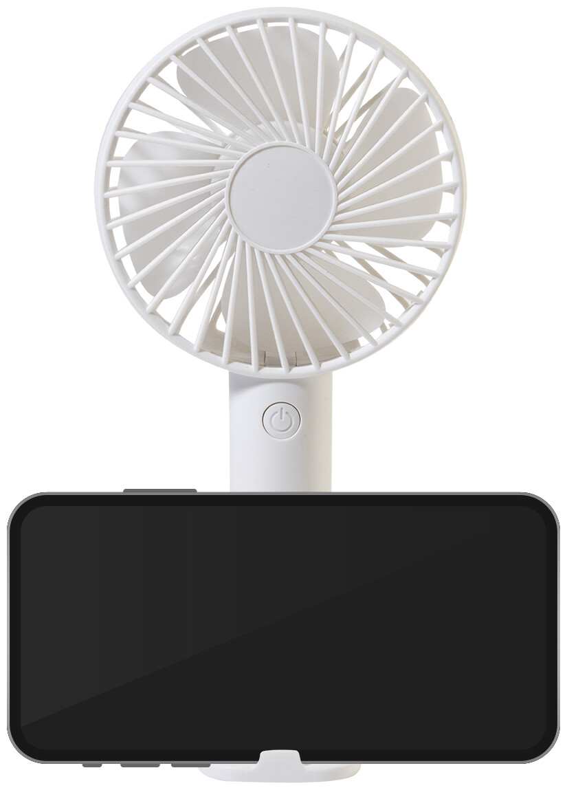 Elektrický ruční větráček z recyklovaného PP s držákem na mobilní telefon, stolním stojanem a vestavěnou dobíjecí baterií s USB portem (800 mAh). Se 3 rychlostmi. Včetně nabíjecího kabelu s USB portem.