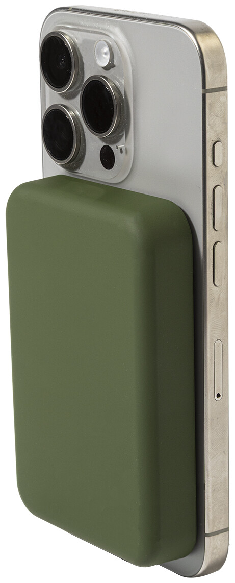 Power banka z recyklovaného ABS s 5000 mAh baterií a vestavěnou magnetickou bezdrátovou nabíječkou (5W). Se vstupem USB-C a portem pro nabíječku. Včetně samolepícího kovového kroužku pro použití magnetické funkce na jakémkoli bezdrátově nabíjecím zařízení. Kompatibilní s iPhone® 12 nebo novějším. Včetně USB nabíjecího kabelu.