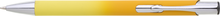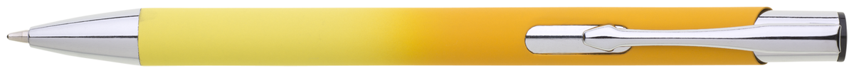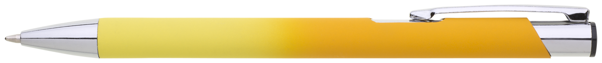 Hliníková propiska se stříbrnými doplňky a měkkým pogumovaným soft povrchem ve světle žluto–tmavě žlutém přechodu. Náplň velkoobsahová, modře píšící