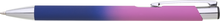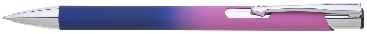 Hliníková propiska se stříbrnými doplňky a měkkým pogumovaným soft povrchem ve tmavě modro–růžovém přechodu. Náplň velkoobsahová, modře píšící.
