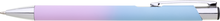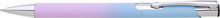 Hliníková propiska se stříbrnými doplňky a měkkým pogumovaným soft povrchem ve růžovo–světle modrém přechodu. Náplň velkoobsahová, modře píšící.
