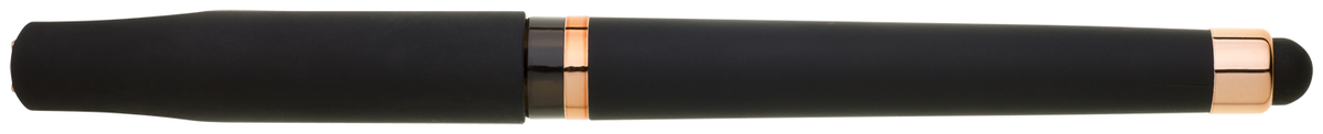 Gelová propiska s s víčkem a touch koncem, soft povrch a doplňky v růžovo-zlaté barvě. Náplň gelová velkokapacitní modře píšící.