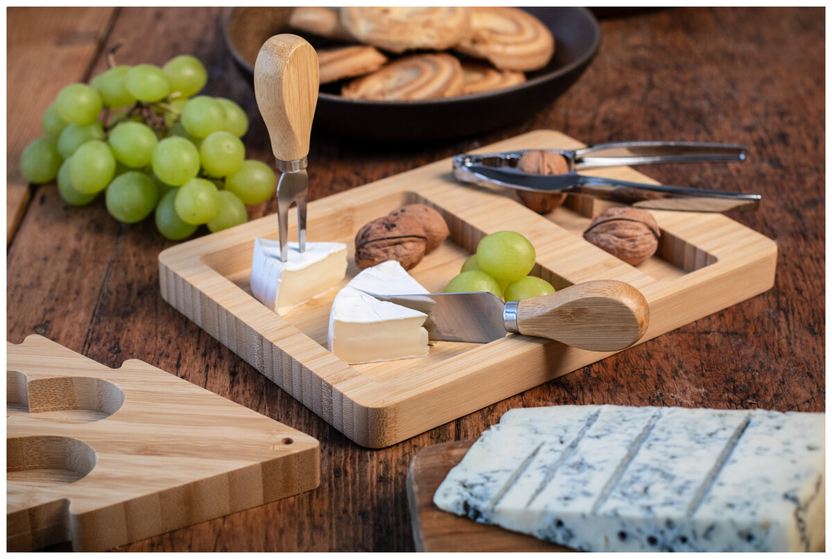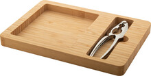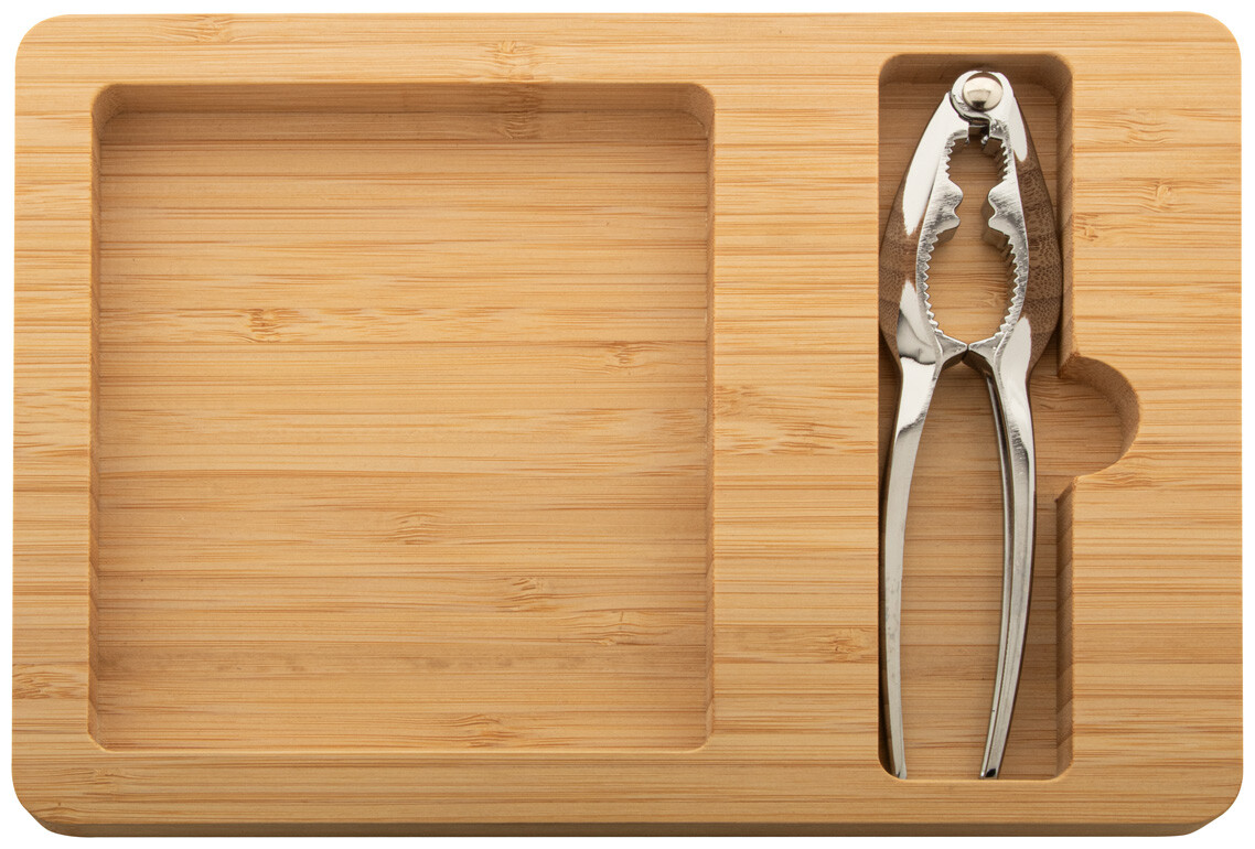Sada na louskání ořechů s bambusovým tácem a kovovým louskáčkem. V kraftové papírové krabici.