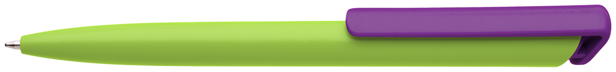 Česká propiska BOIA v minimalistickém designu světle zeleného oválného těla s dynamickým tvarem fialového masivního klipu. Tělo i klip nabízí velký prostor pro značení logem zákazníka. Materiál plast, náplň velkoobsahová, modře píšící. BOIA je vyráběna v České republice.