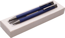 Dárková sada modré propisky a mikrotužky s pogumovaným povrchem a šedými doplňky v luxusním dárkovém pouzdru s průhledným okénkem.