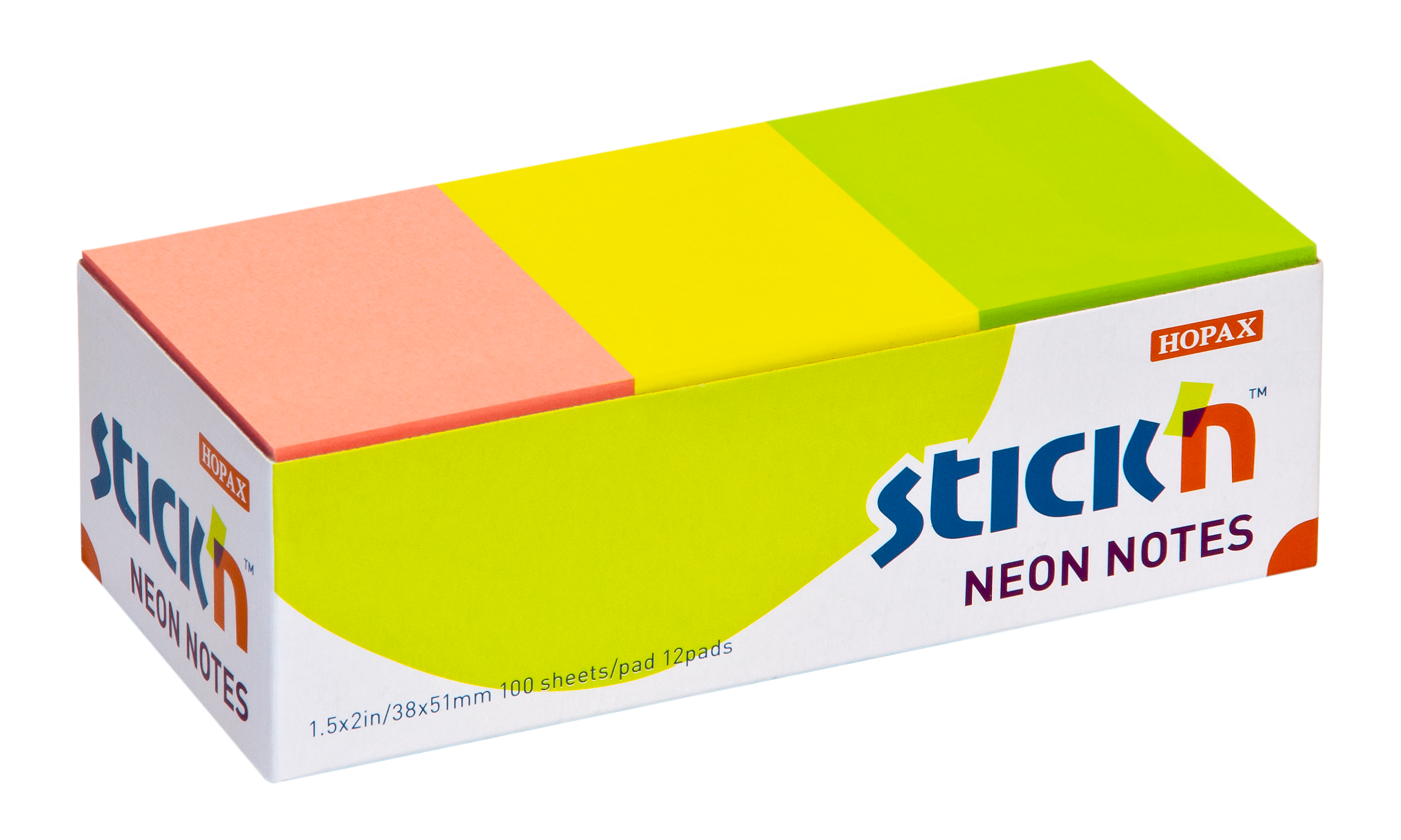 Samolepicí bloček Stick'n by Hopax, 38 x 51 mm, neon mix, 12 x 100 lístků