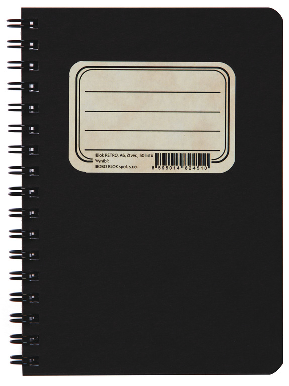 Blok s boční kroužkovou vazbou, tvrdými deskami v RETRO designu, 50 listů. Formát: A6, čtverečkovaný.