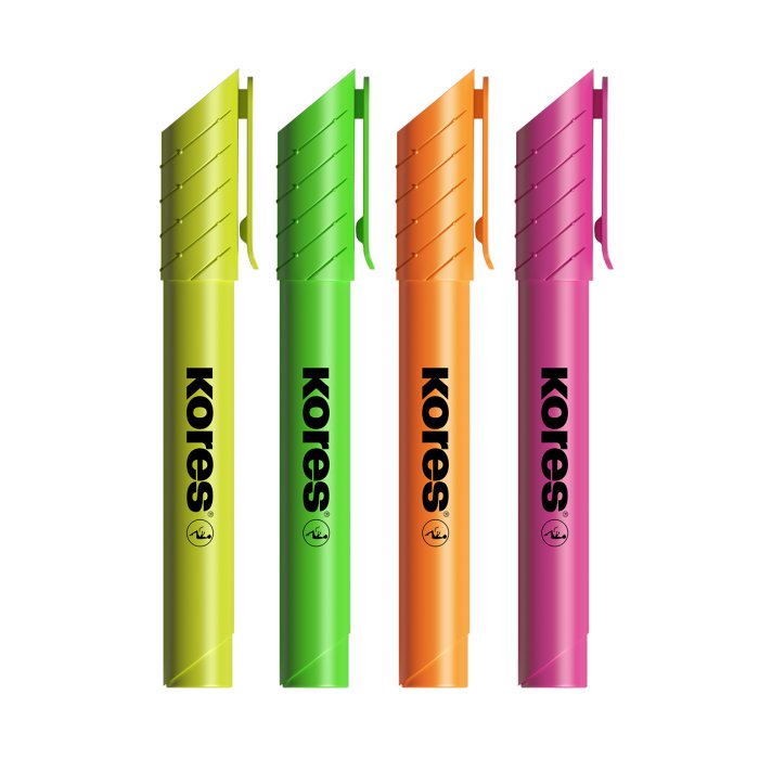 Sada 4 ks zvýrazňovačů vysoké kvality se seříznutým hrotem v unikátním designu. Plněny fluorescentním inkoustem na vodní bázi v barvách žluté, oranžové, zelené a růžové. Vydrží bez víčka až několik dní. Více inkoustu pro delší životnost. Klip na víčku zabrání svévolnému přemístění zvýrazňovače. Šířka stopy 0,5 – 5 mm. Vyrobeno v ČR.