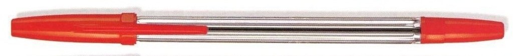 Jednorázové kuličkové pero, šíře stopy 1,0 mm, plastové průhledné tělo s doplňky v barvě náplně. Barva náplně: červená.