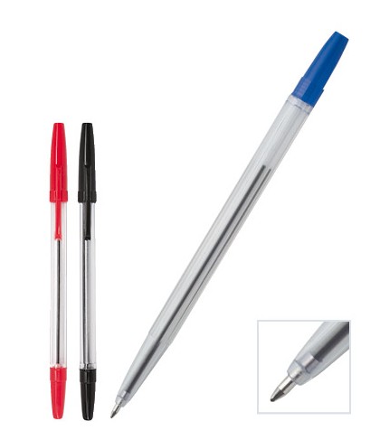 Jednorázové plastové kuličkové pero s průhledným tělem pro kontrolu množství náplně. Náplň v barvě doplňků.