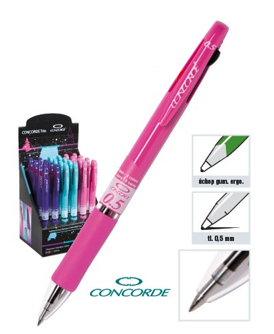 Plastové tříbarevné kuličkové pero s vysoce kvalitní mechanikou. Ergonomický gumový úchop. Píše lehce a tence - hrot 0,5 mm. Mix 3 pastelových barev. Náplň CONCORDE Trio.