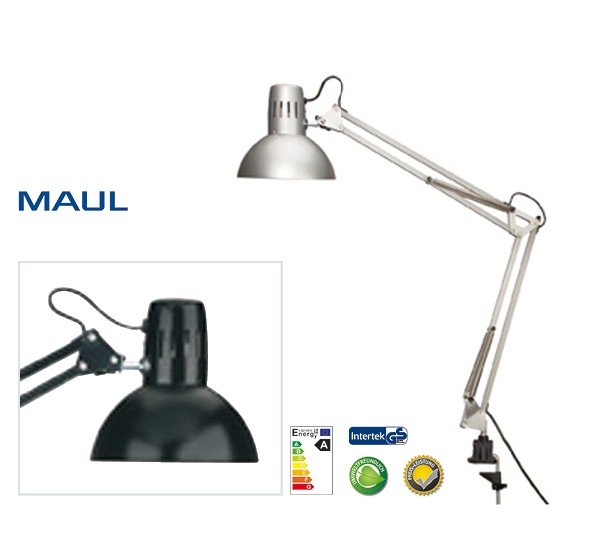 Kovová lampa v klasickém designu. Energetická třída „A“. Výška při běné pracovní pozici 51 cm. Stínidlo o průměru 17 cm. Svorka na přichycení k okraji stolu (do 5,5 cm).