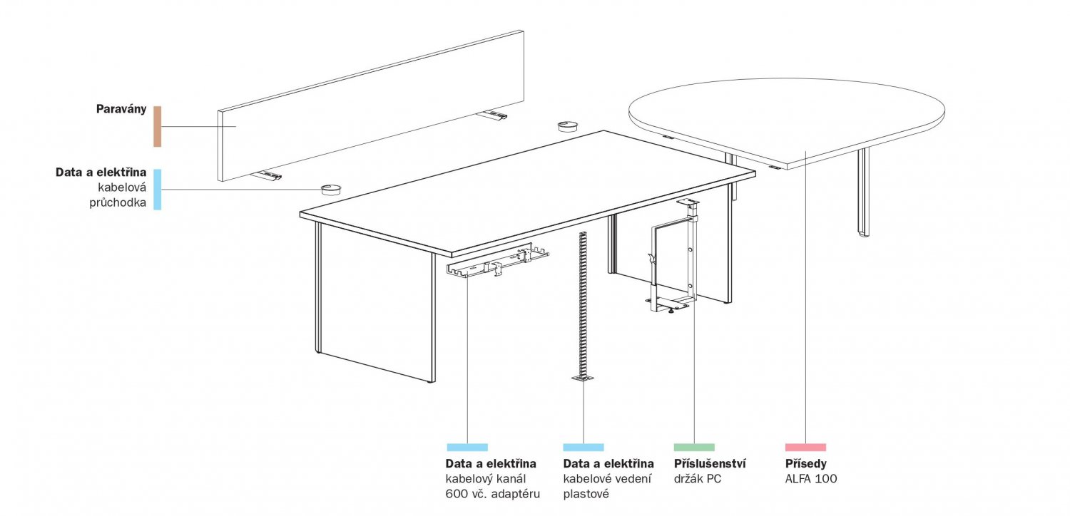 Pracovní deska je z LTD 25 mm zakončená ABS hranou a hliníkové nohy jsou ve standardním provedení povrchově upraveny eloxováním.