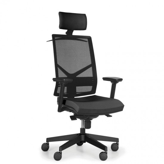 židle s vysokým síťovaným opěrákem a výškově nastavitelnou bederní výztuhou, volitelný podhlavník se sítí nebo čalounem výškově a uhlově nastavitelný, možnost doplnění ramínka na oděv, nastavení výšky opěráku s uzamykáním, čalounění ze studené pěny, nový design sedáku s výrazným zaoblením přední hrany a robustní výškou pro maximální pohodlí synchronní mechanismus s čtyřnásobnou aretací, automatickým nastavením síly protiváhy a nastavením hloubky sedáku, plastová báze, kolečka pr. 60 mm pro měkké podlahy, volitelné područky, nosnost 150 kg, český výrobek, záruka 60 měsíců