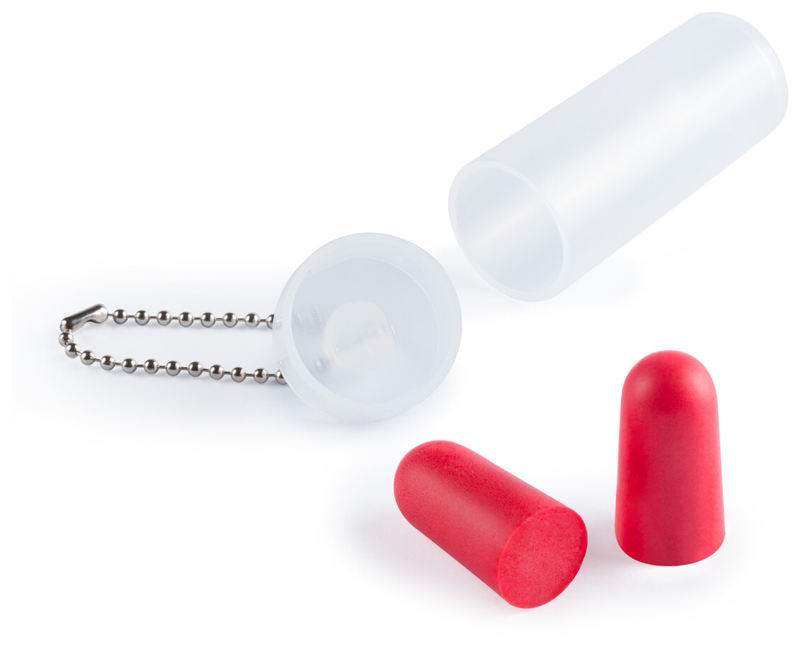 Barevné špunty do uší z EVA materiálu v transparentní plastové krabičce s kovovým řetízkem.