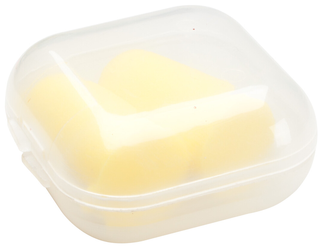 Barevné špunty do uší v průhledném, plastovém pouzdru, vyrobeno z EVA materiálu.