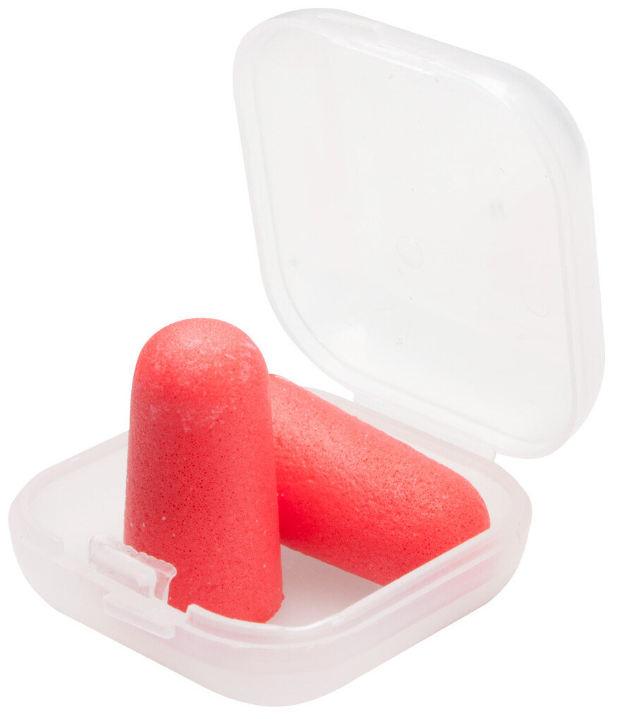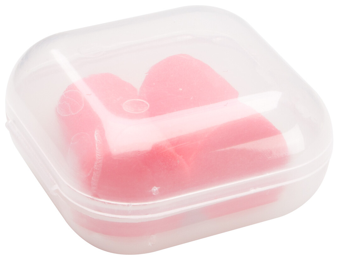 Barevné špunty do uší v průhledném, plastovém pouzdru, vyrobeno z EVA materiálu.