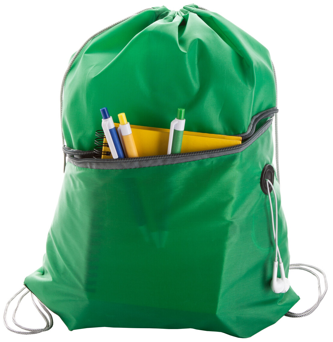Vak na stažení šňůrkou, s kapsou na zip a otvorem na sluchátka, 210D polyester.