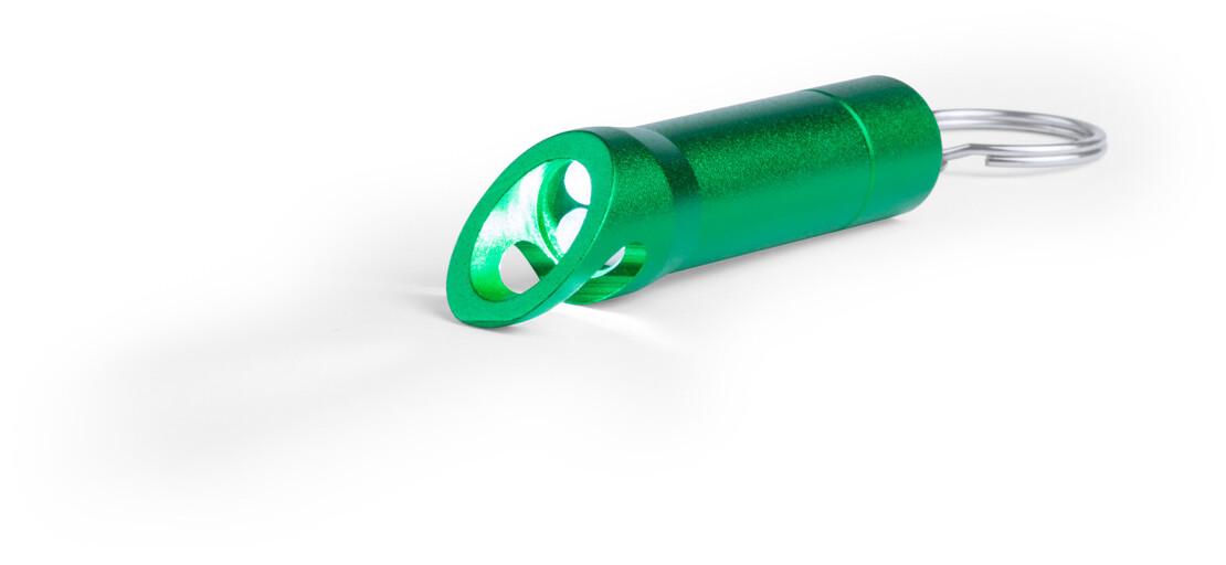 Mini hliníková baterka s 3 LED diodami, otvírákem na láhve a přívěškem na klíče. Dodáváno s knoflíkovou baterií.