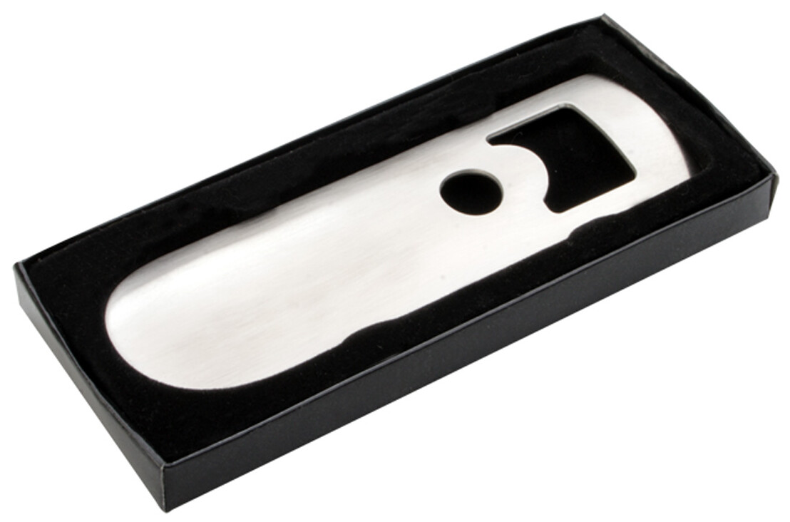 Kovový otvírák v krabičce z černého kartonu.