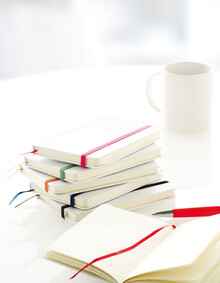 Poznámkový blok s bílými deskami, 80 čistými listy a barevnou gumičkou. Velikost A6.