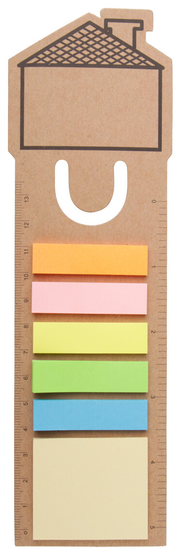 Papírová záložka do knihy a pravítko se samolepícími lístky s domečkem na konci.
