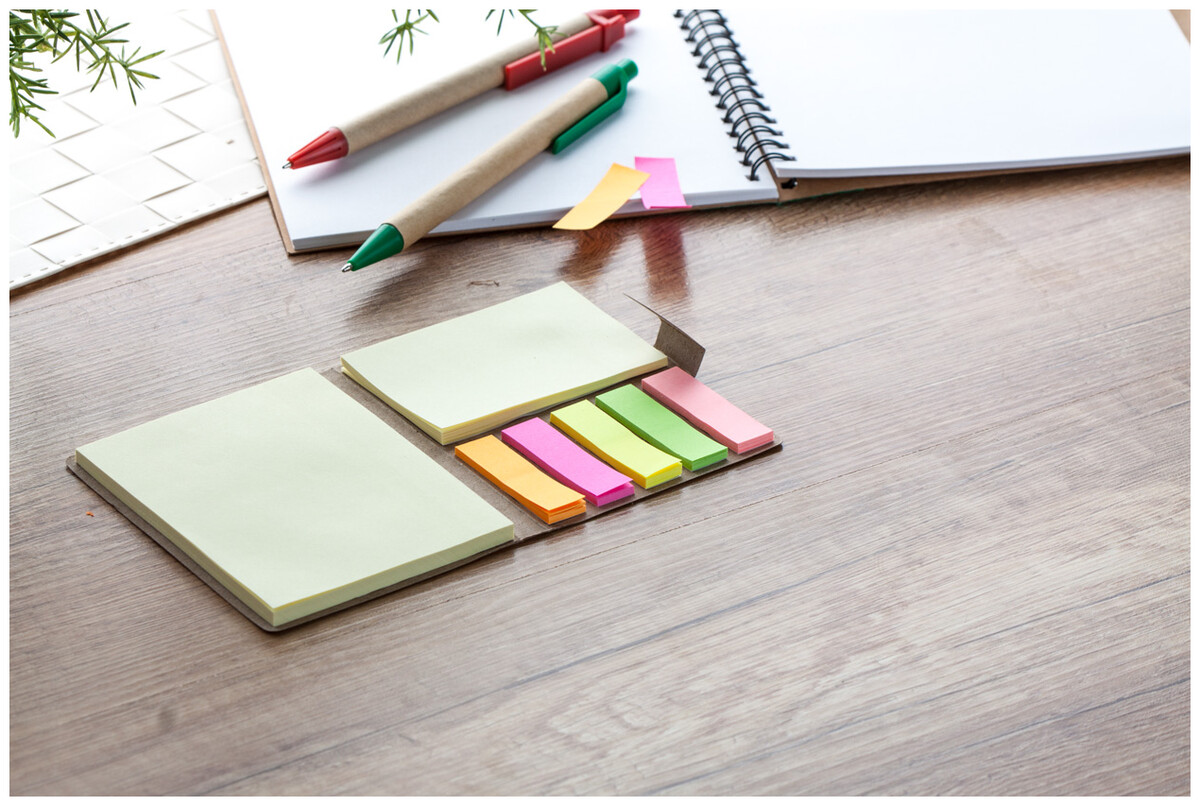 Samolepící poznámkový blok s 50 velkými a 25 středními poznámkovými lístky a 125 značkovači stránek (v 5 různých barvách) v recyklovaném papírovém pouzdře.