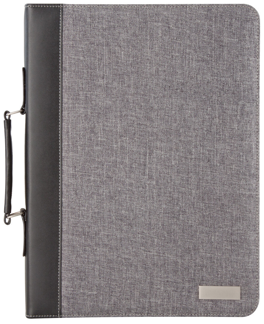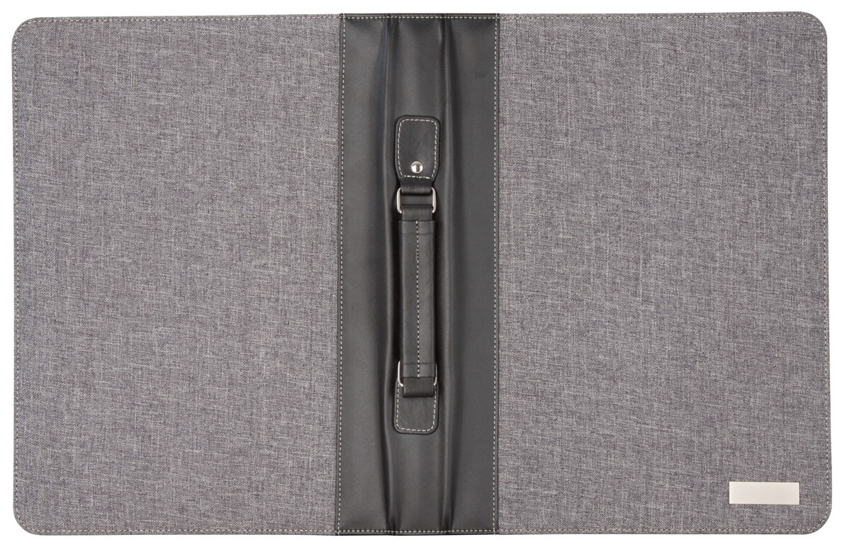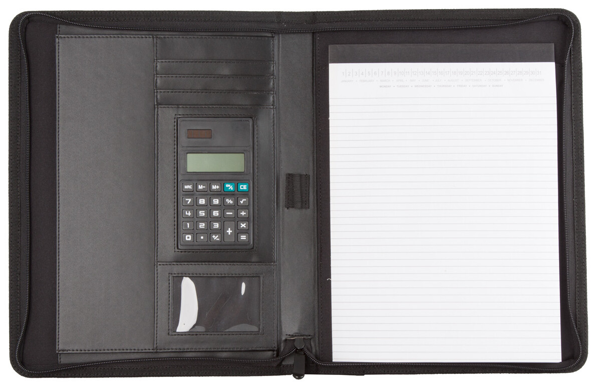 A4 sloha na dokumenty s deskami z PU kůže a plátna s kovovým štítkem, na zip s uchem a s 20 listým linkovaným blokem a solární kalkulačkou.