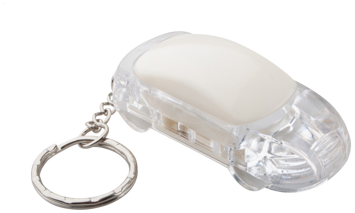 Plastový přívěšek na klíče ve tvaru auta s 1 LED diodou a kovovým kroužkem, vč. knoflíkové baterie.