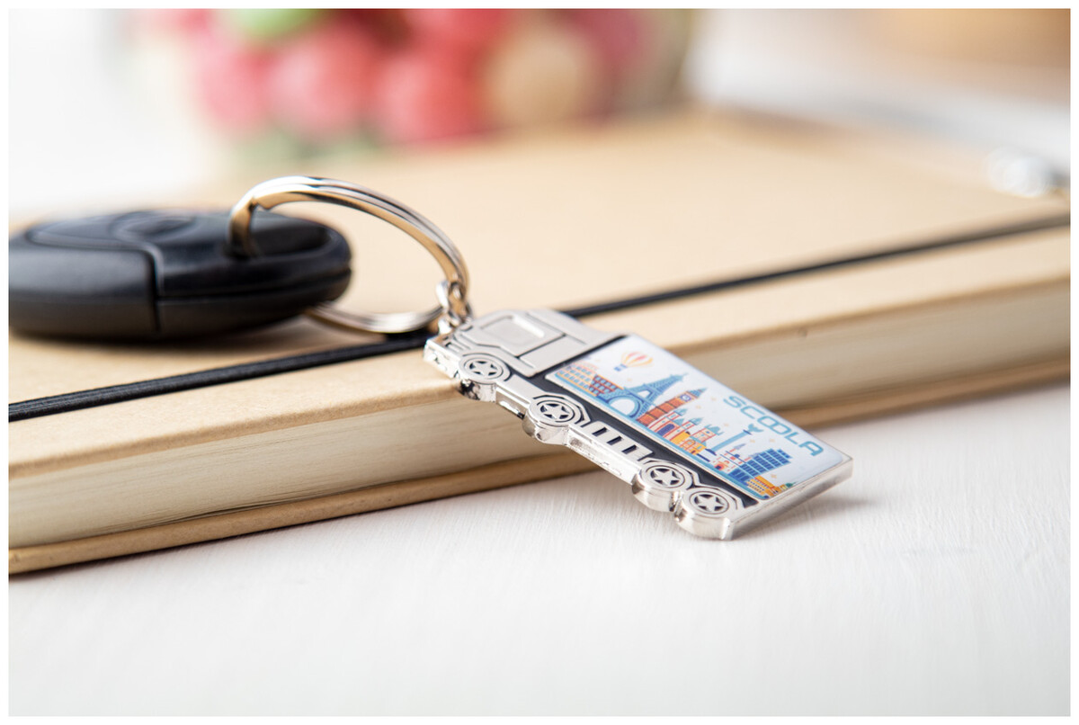 Kovový přívěšek na klíče ve tvaru kamionu v černé kartonové krabičce.