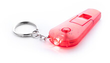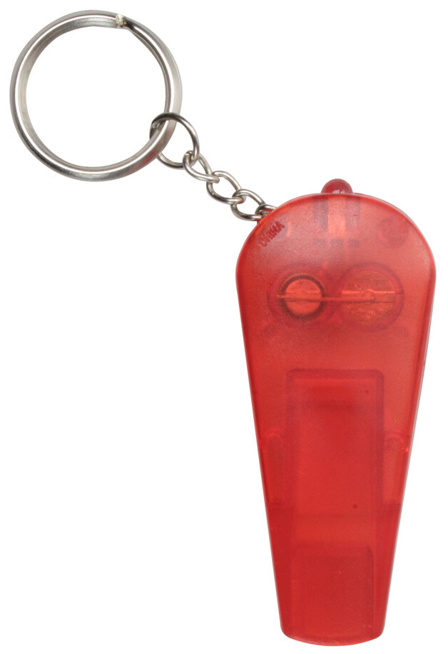 Transparentní plastová píšťalka s kroužkem na klíče se svítilnou, vč. baterií.