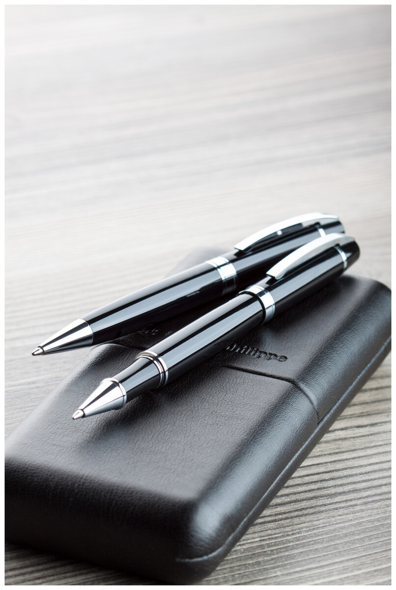 Sada per - elegantní kovové kuličkové pero a roller s lesklým chromovaným zdobením značky André Philippe. V dárkové krabičce z PU kůže a s modrou náplní.