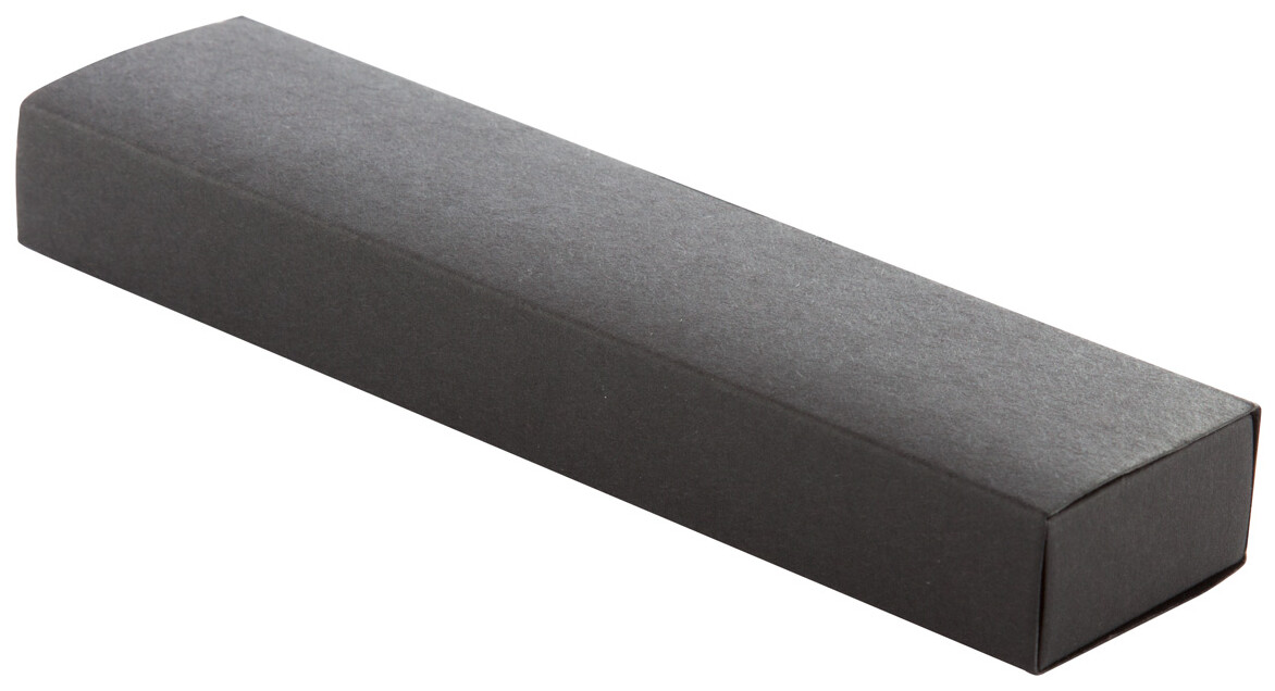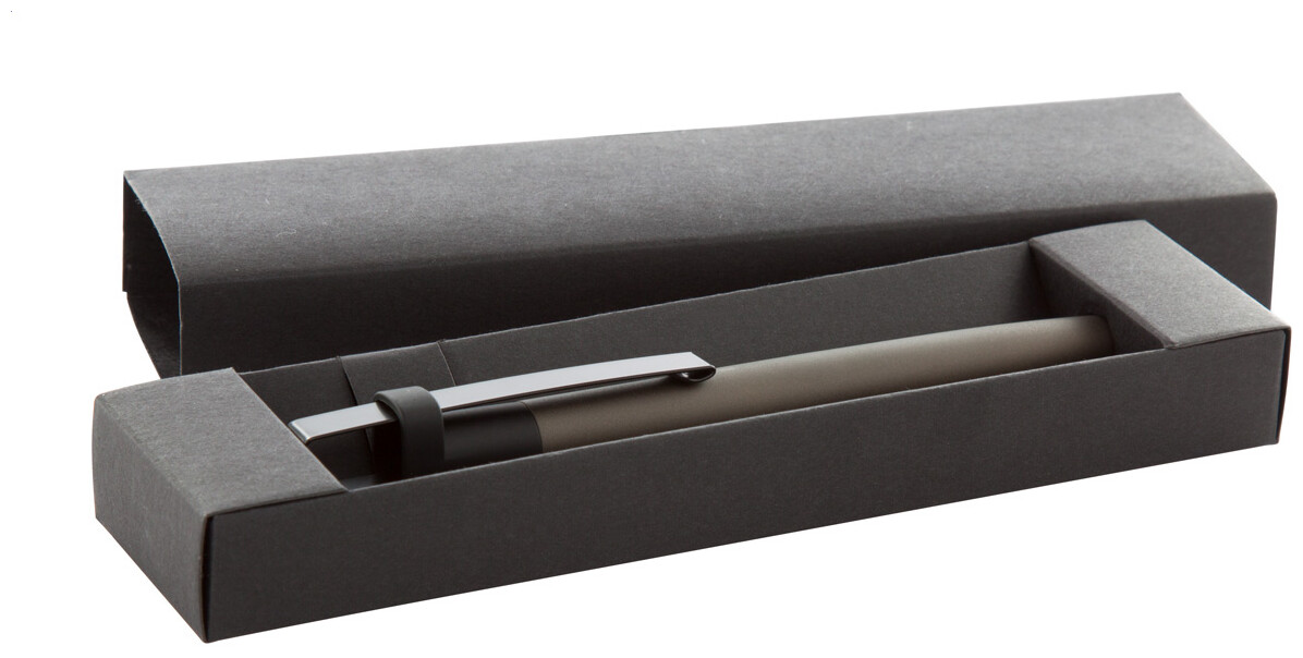 Hliníkové pero s modrou náplní v černé dárkové krabičce.