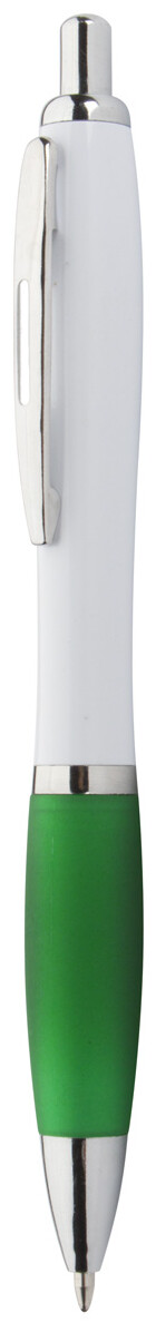 Plastové kuličkové pero s bílým tělem, barevným úchopem a lesklými chromovanými částmi. S modrou náplní.