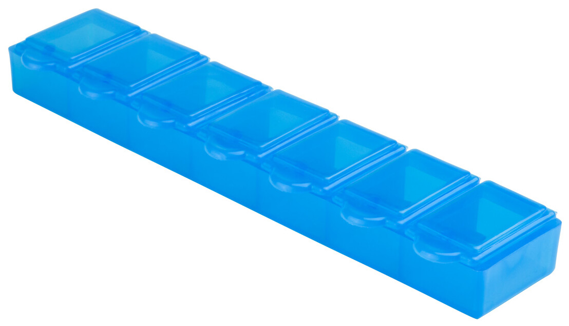 Plastový, týdenní box na pilulky, se 7 přihrádkami.