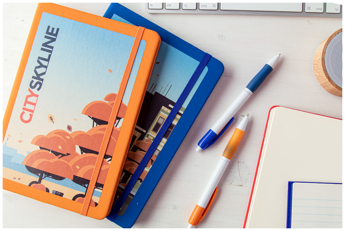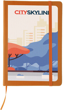 Poznámkový blok se 100 listy, záložkou a gumičkou.
