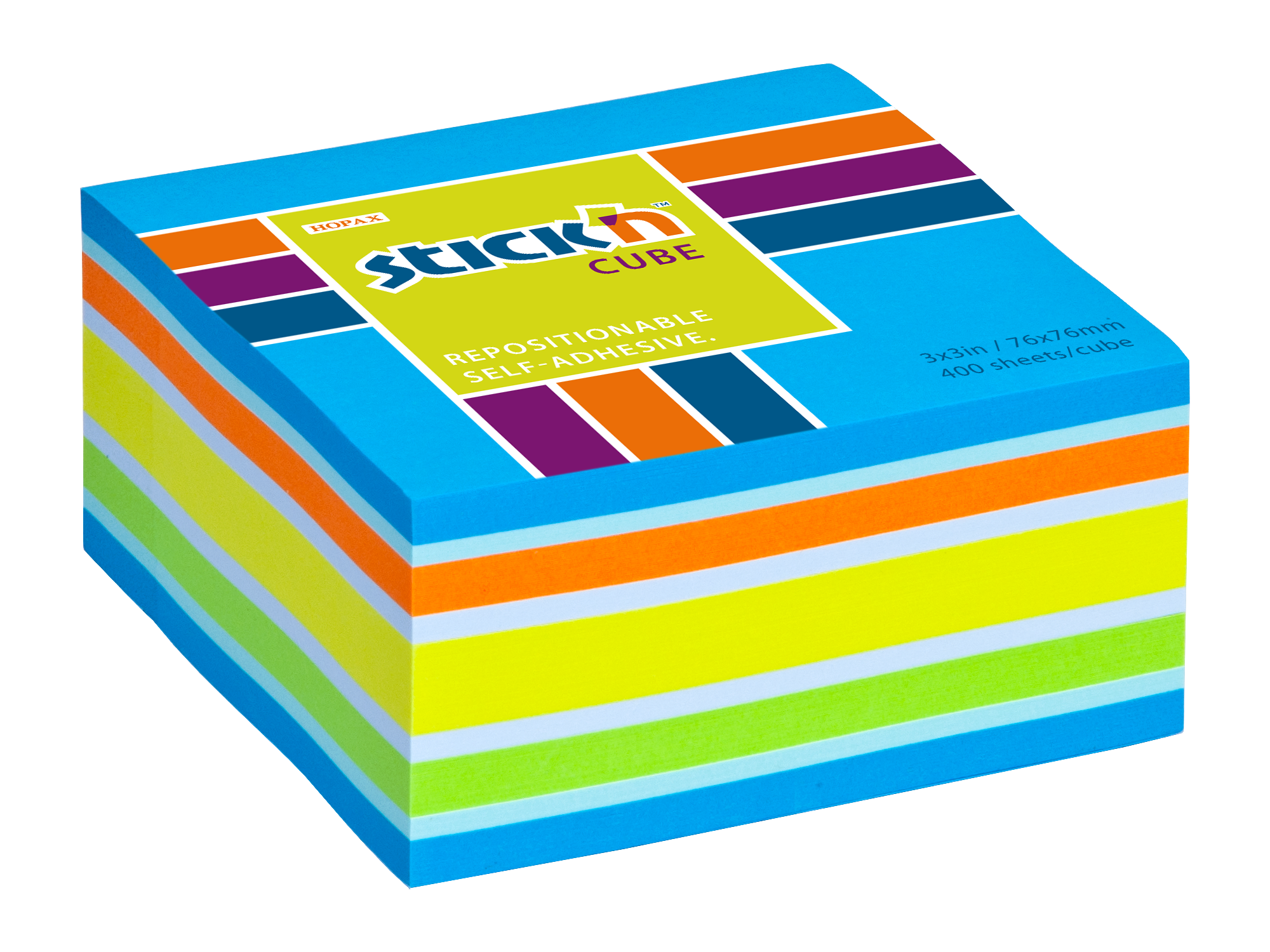 Samolepicí bloček kostka Stick'n by Hopax, 76 x 76 mm, neon modrý mix, 400 lístků