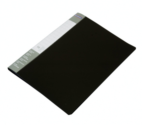Praktické pevné desky s integrovanými kapsami formátu A4. Vyrobeno z ekologicky šetrného PP. Barva obálky je neprůhledná. Hřbetní štítek lze vyměnit. Celkový vnější rozměr: 235 x 310 mm, 20 vnitřních kapes, barva: černá.