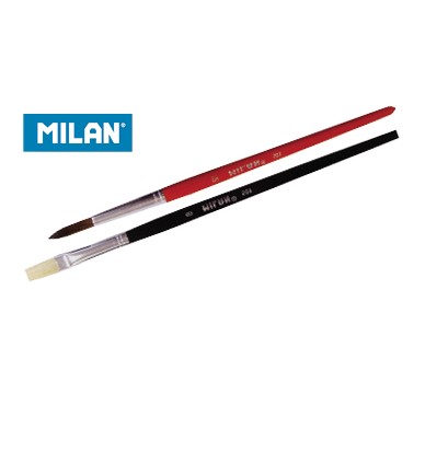 Kvalitní štětce MILAN na výtvarnou výchovu. Štětce mají bezešvou hliníkovou zděř, dlouhou násadku lakovanou v barvě přírodní borovice. Kulaté štětce jsou vyrobeny z vlasu pony a ploché štětce z prasečí štětiny.
