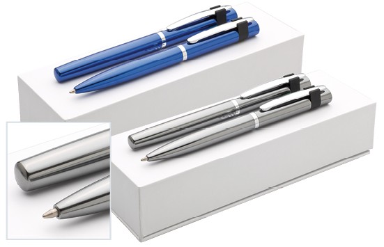 Elegantní dárková sada s propiskou a rollerem v bílé krabičce se značkou GABRIELIS. Tužky mají otočný mechanismus, roller odnímatelné víčko. Povrch tužek lesklý se stříbrným klipem v černém úchytu. Náplň pro kuličkové pero 4441.